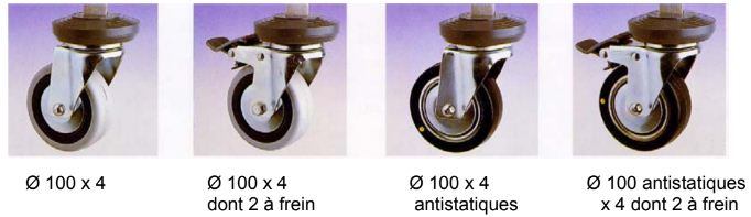Roulettes 100 mm normales ou antistatiques pour une mobilité fluide.