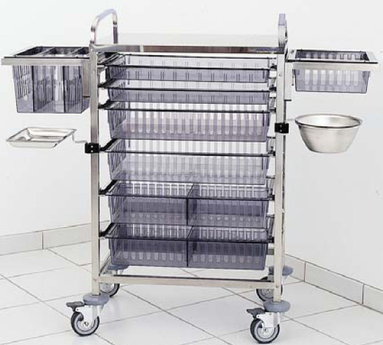Ce chariot de soins est un équipement de transport pour bacs de rangement.