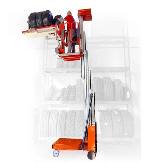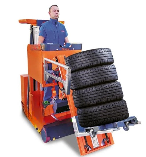 Ce chariot préparateur de commande avec double outil permet de soulever, déplacer et stocker un jeu complet de pneus.
