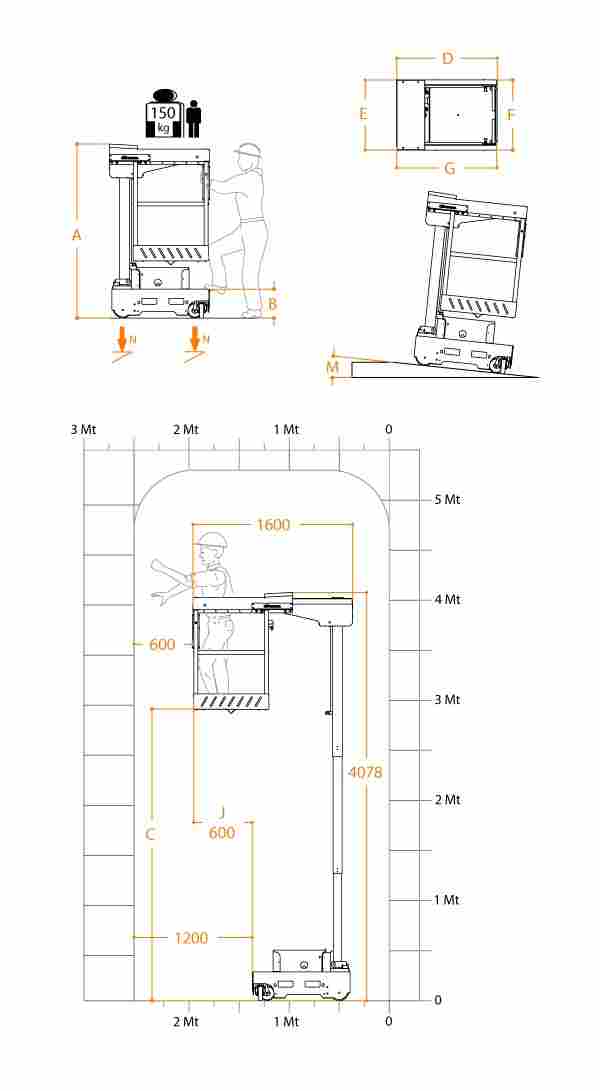 - Vitesse maximale (Montée-Descente) : 0,2 m/s - Vitesse de translation panier : 68,5 m/min - Vitesse de déplacement à hauteur maxi : 10,7 m/min
