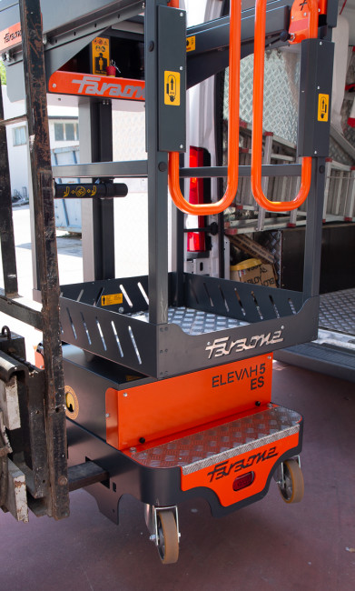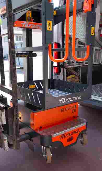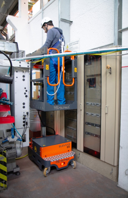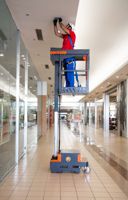 Cette nacelle élévatrice avec extension du panier est conçue pour les interventions en hauteur jusqu'à 4,9 m.