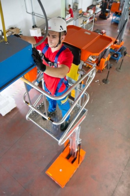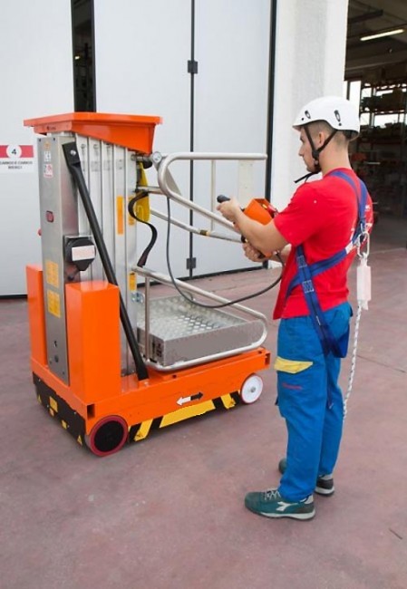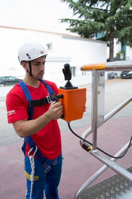 Elle fonctionne sur batterie 24 v et dispose de son chargeur embarqué. L’accès dans le panier est facilité par un portillon levant qui se bloque en ouverture dès que le panier monte.