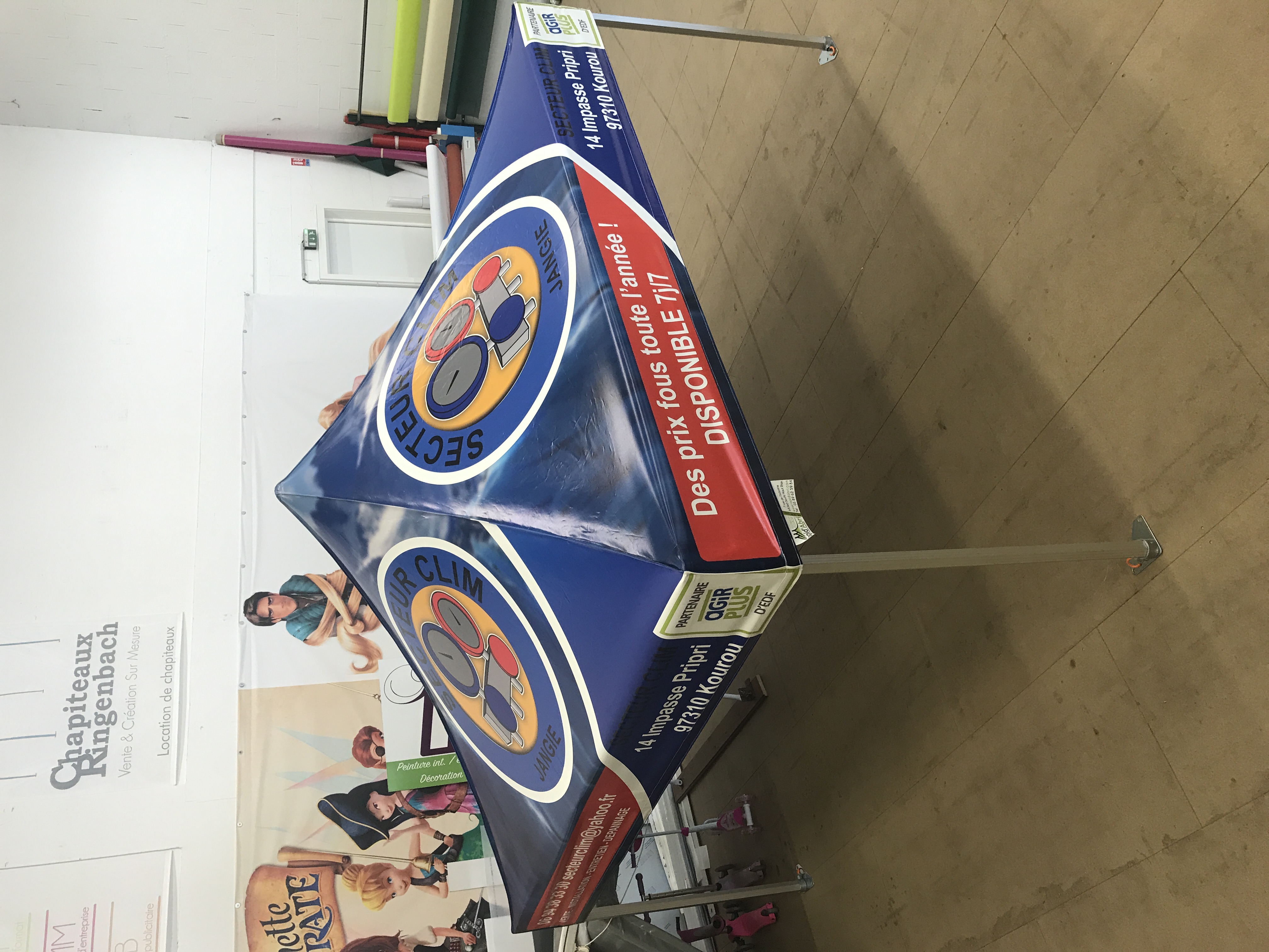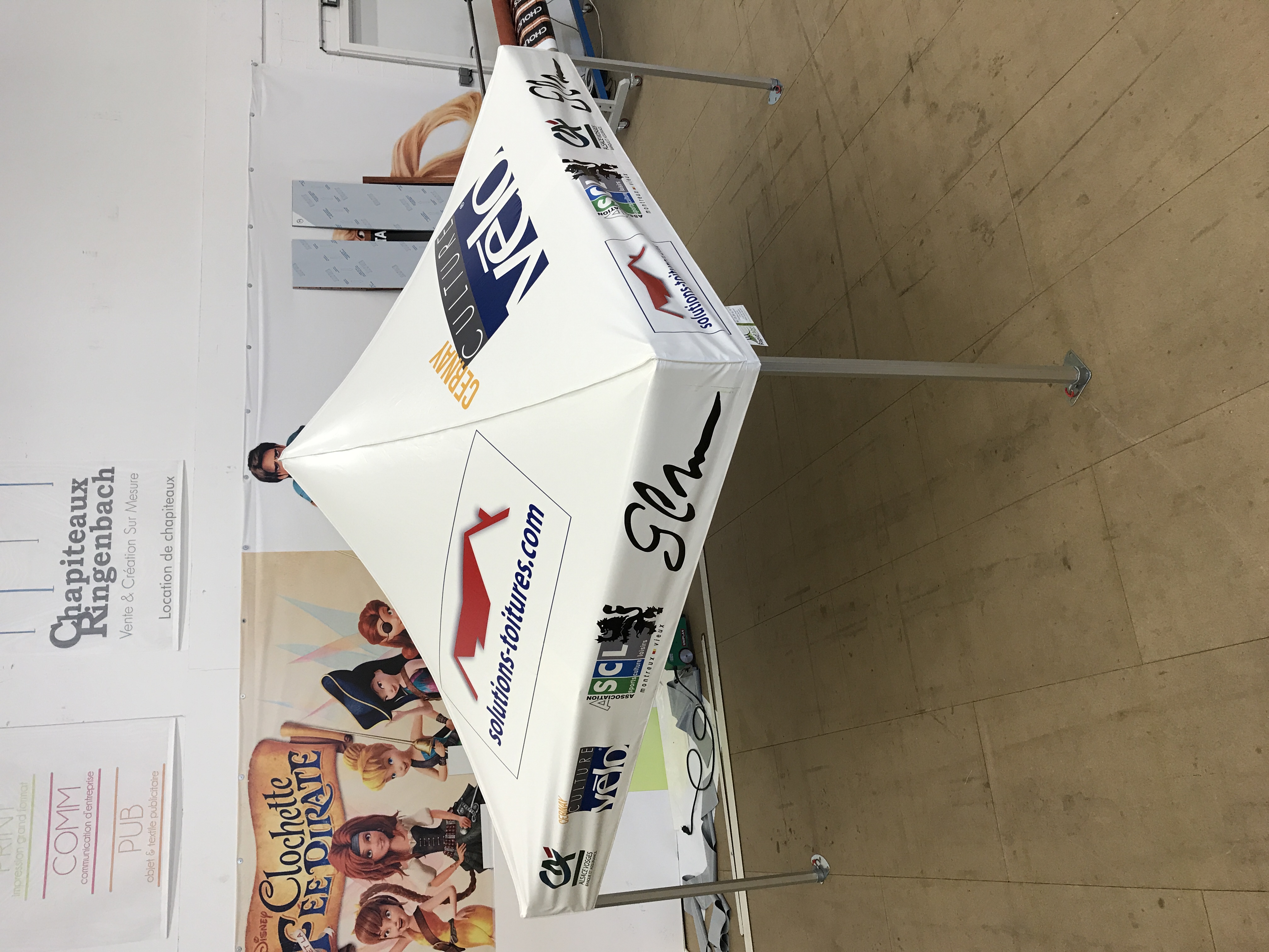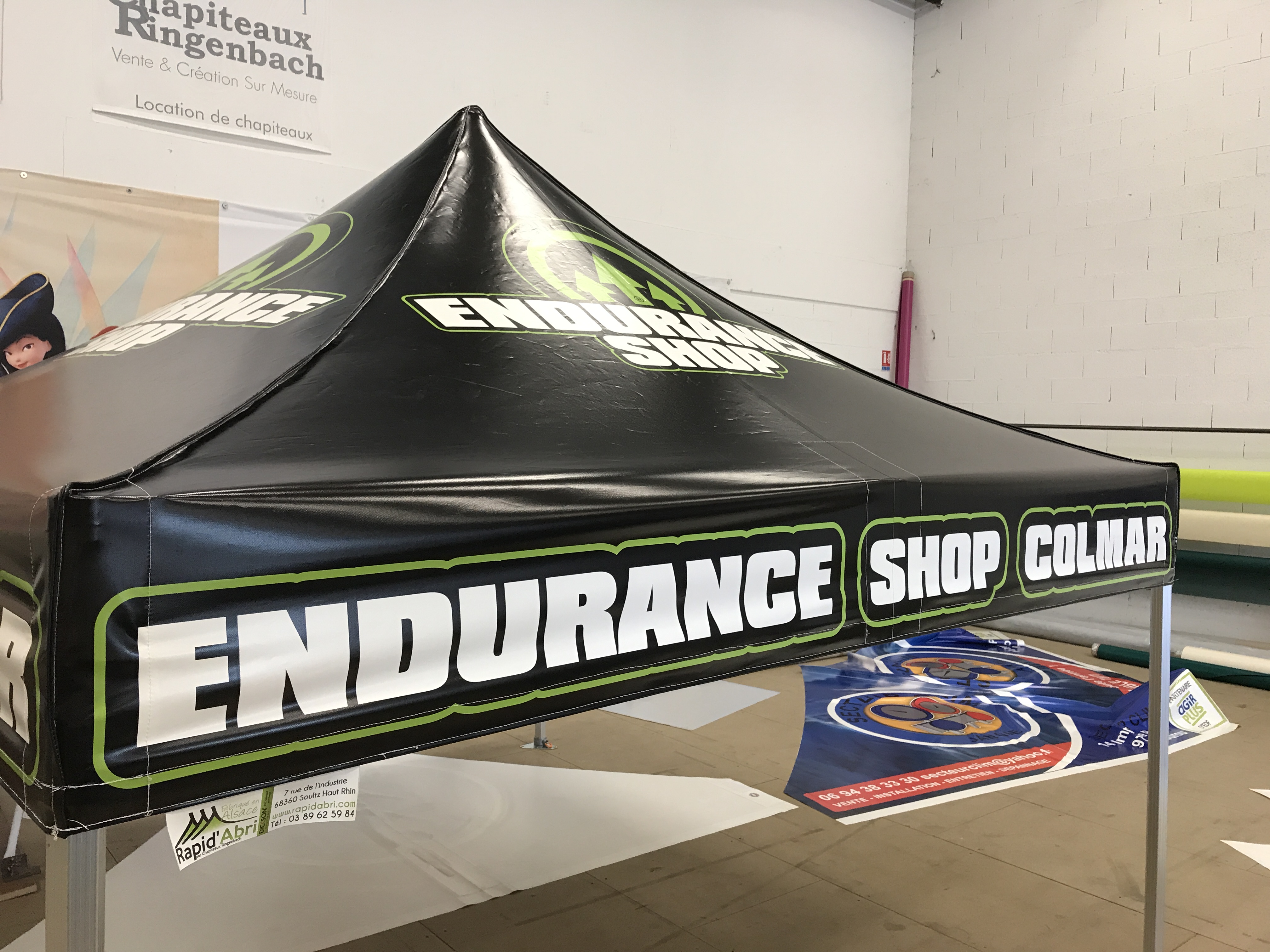L'entoilage de la structure est imprimé et fabriqué en Alsace dans nos ateliers sur la base d'un PVC Français de 500gr/m2 ignifugé M2 et garantie 5 ans par le fabricant Dickson Coatings.