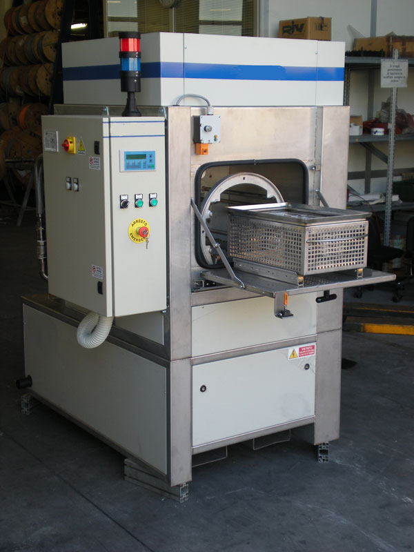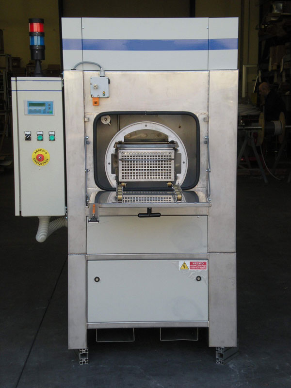- La rotation continuelle du panier autour de l’axe horizontal ajoute une action mécanique ultérieure en favorisant aussi l’égouttement final des pièces pendant l’auto-séchage.