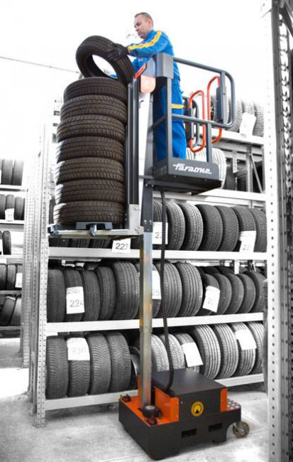 Grâce à ce système pratique, l'opérateur n'a pas à soulever les pneus, il doit juste les rouler de l'outil à l'étagère.
