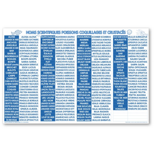 Un support qui renseigne les clients sur l’équivalence entre noms communs et noms scientifiques des poissons, coquillages et crustacés.
