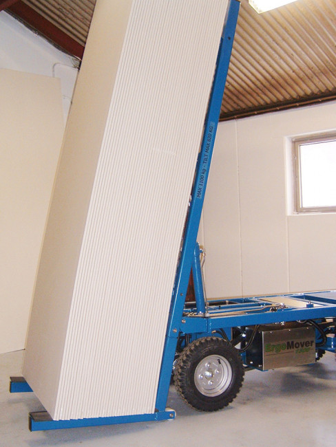 Ce chariot électrique est doté d'une plateforme élévatrice et basculante, capable de présenter jusqu'à 42 plaques verticalement, prêtes à être posées.
