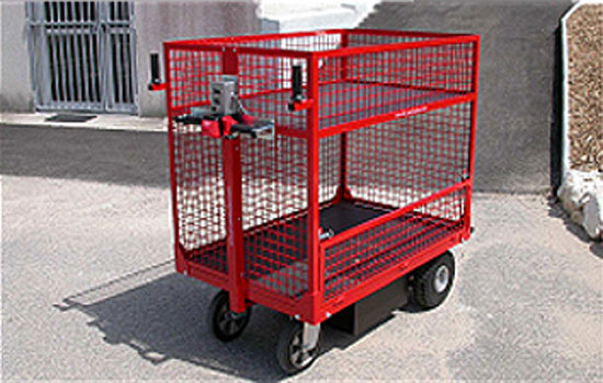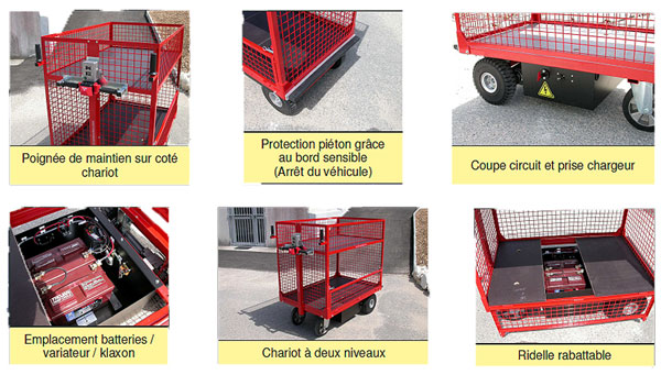 Je recherche pour mon client un chariot motorisé équipé de 2 niveaux pour transporter du matériel en extérieur sur un chemin goudronné avec une légère montée.