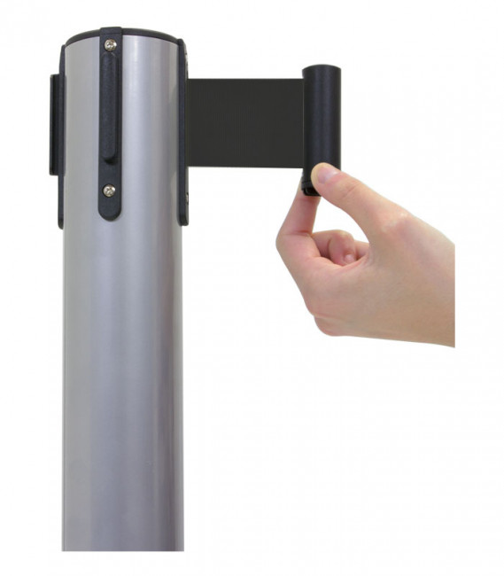 Ce poteau séparateur gris avec bande extensible noire est parfait pour la gestion des files d’attente ou la séparation des espaces.
