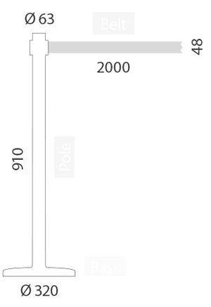 Les poteaux séparateurs avec bande extensible ont une hauteur de 910 mm, une base en béton pour la stabilité, avec un diamètre de Ø320mm.