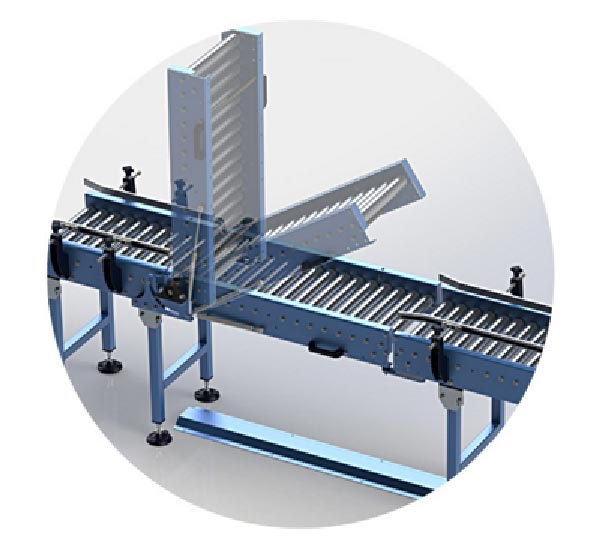 convoyeur à rouleaux est un système relevable à 90° idéal pour le déplacement de charges à fond plat ou renforcé par des lattes, à une hauteur définie.