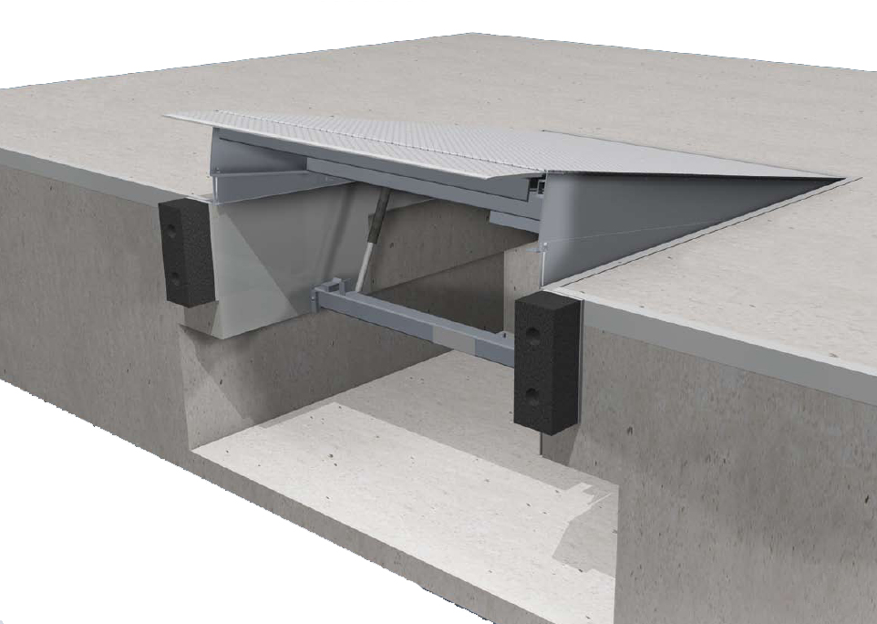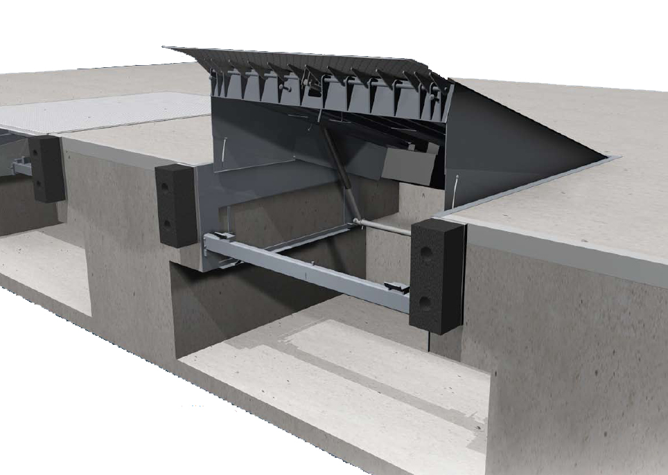 Dans la version du niveleur à lèvre basculante (type PS), après avoir élevé la plate-forme du niveleur à la plus haute position, la lèvre se déplie et le plateau du niveleur se pose sur la surface de chargement du camion.