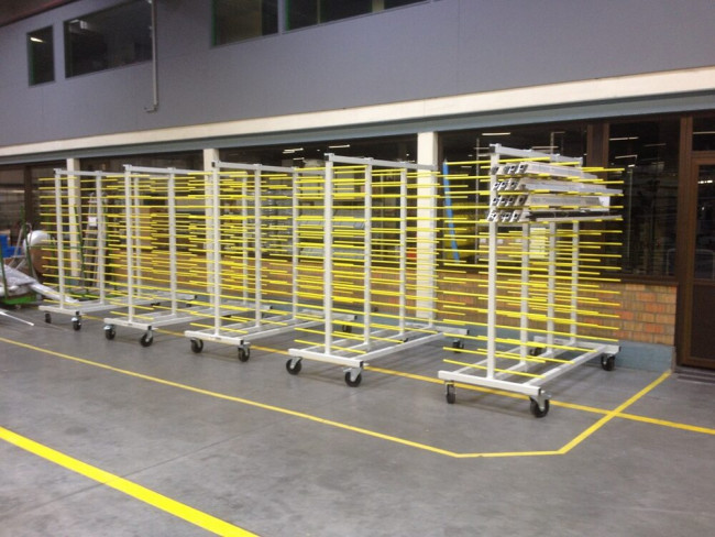 Chariot à profilés pour le stockage horizontal et le transport des profilés sciés. Les bras de support sont adaptés pour le stockage de profilés en pvc, en aluminium ou en bois laqué.