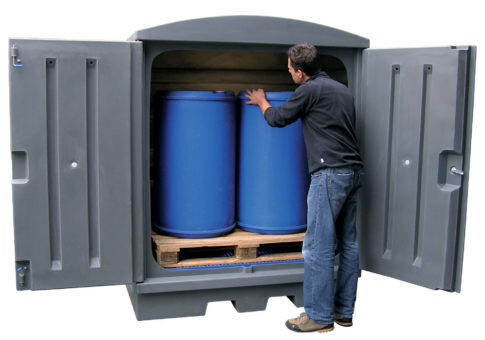 Ce conteneur de rétention peut recevoir deux fûts palettisés.