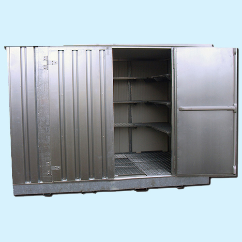 Ce modèle de bungalow de stockage 2 portes battantes et avec isolation est parfaitement adapté pour stocker les fûts contenant des hydrocarbures, les substances chimiques, ou tous produits dangereux et polluants.