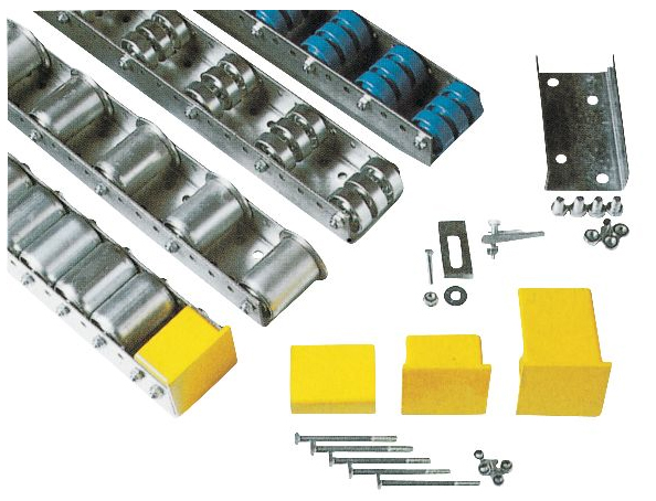 Accessoires : butées droites, butées inclinées, liaisons entre rails, systèmes de fixation, pièces détachées (rouleaux, axes, rails).