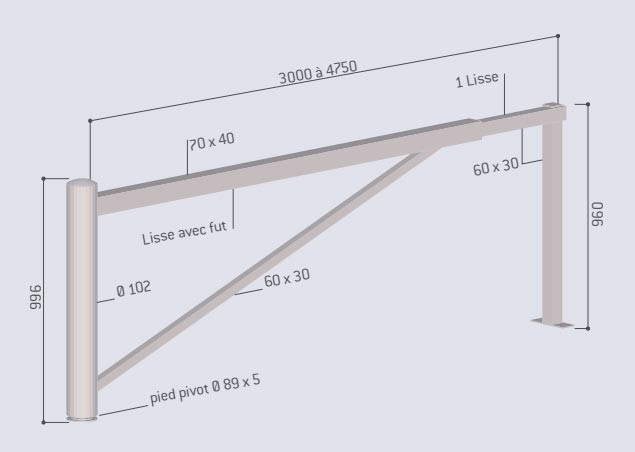 Cette barrière pivotante télescopique est modulable en largeur de 3000 à 4750 mm, elle s’adapte facilement à votre environnement.