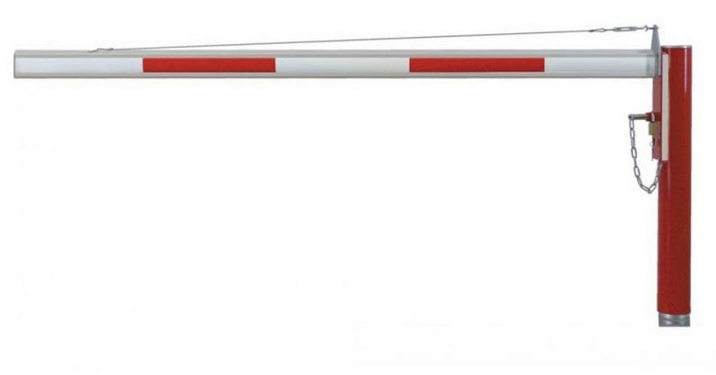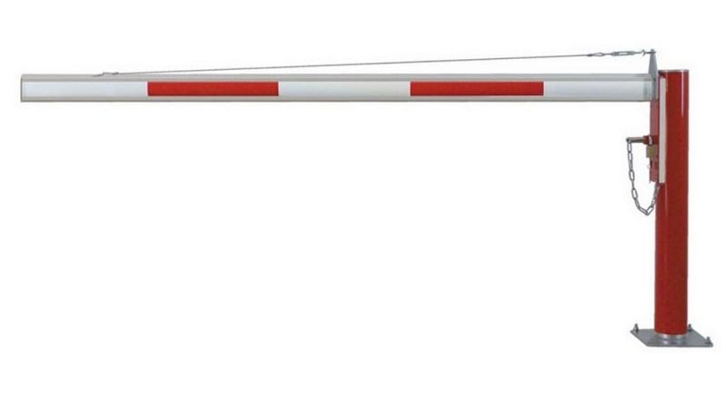 barrière levante manuelle a clé prisonnière longueur 6 mètres support sur platine (variante a sceller) lisse avec bandes réfléchissantes