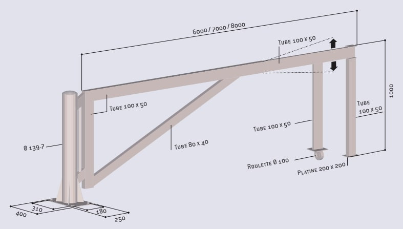 Sa structure comprend une lisse en profilé de 100 x 50 mm (épaisseur 3 mm) et un renfort pivotant de 80 x 40 mm. Le système de pivotement sur un fût de Ø 140 mm permet d'absorber les irrégularités du sol et d'assurer un fonctionnement fluide.