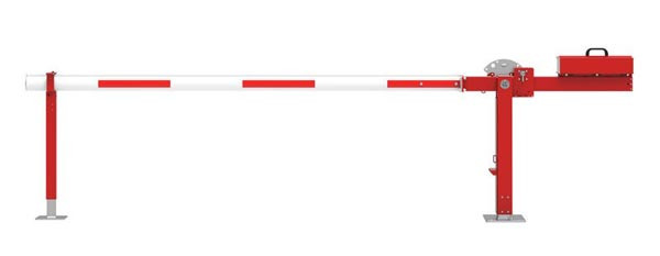 Barrière levante manuelle avec lisse aluminium sur poteau, finition laqué blanche bandes rouges.