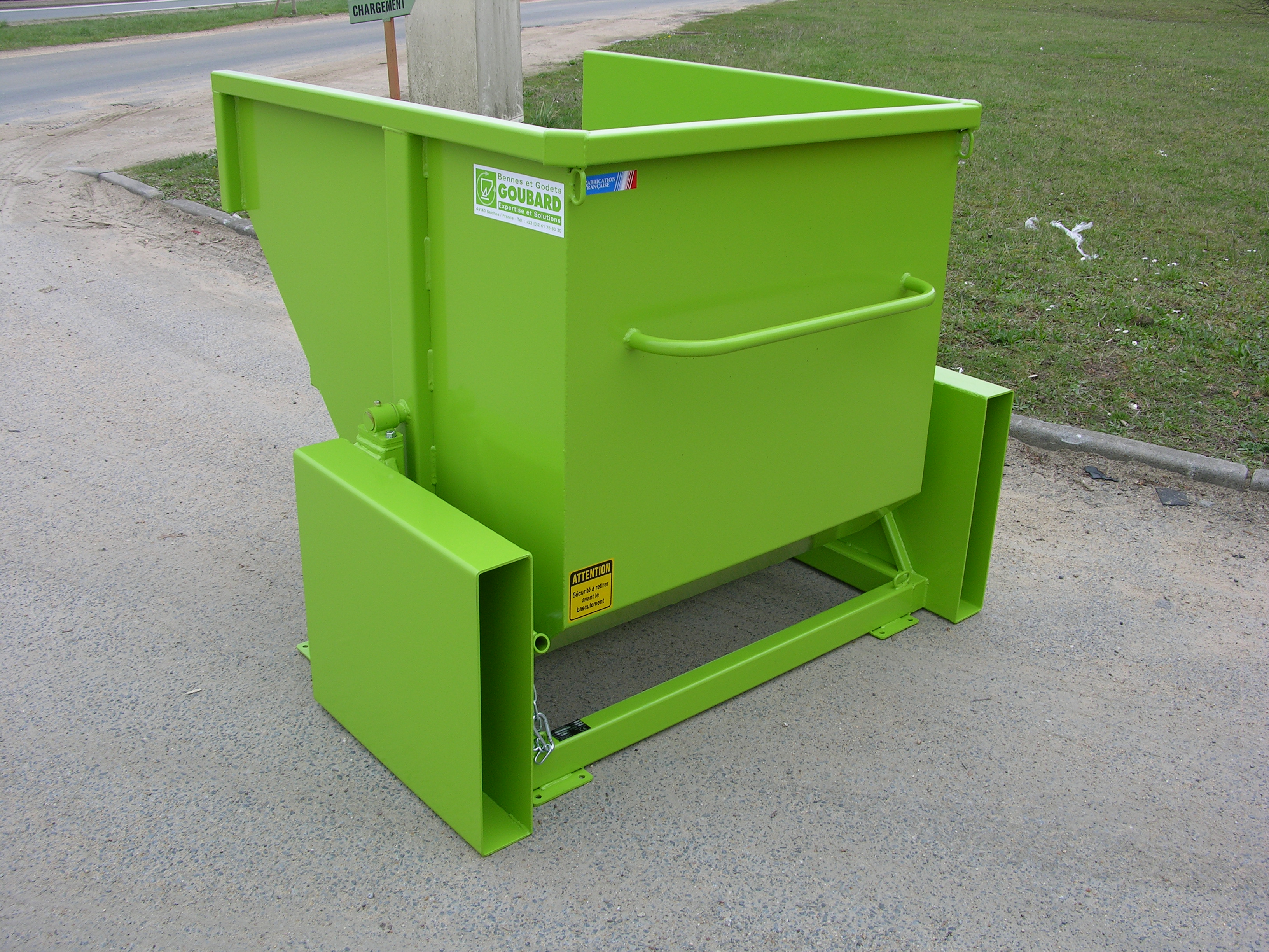 5 Bennes avec prise pour chariot à pinces ( hauteur pinces 600mm), benne à fond ouvrant d"une hauteur de 1050mm maximum. L"utilisation est pour collecter les déchets au nettoyage du plateau de semi-remorque.