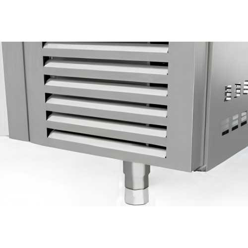 Cette table de préparation réfrigérée professionnelle est équipée de 5 portes pleines et d’une carosserie en inox AISI-304 18/10 (sauf partie arrière).