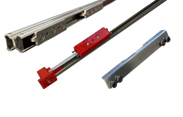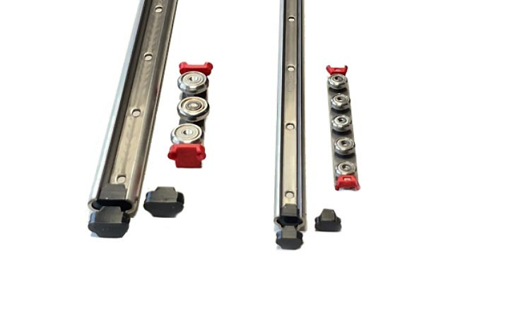 Ce guidage linéaire en inox est disponible en trois tailles développées par nos soins (22, 33, 44), associées à trois types de patins à rouleaux.