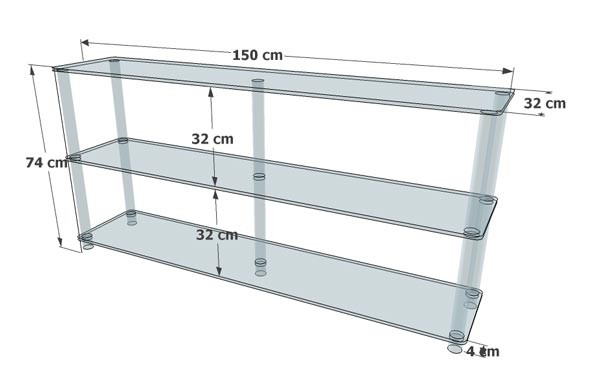 Plexiglas épaisseur 1 cm 3 étages de 150 x 32 cm Espace entre étage de 32 cm Hauteur totale : 74 cm Assemblage sans aucun outillage