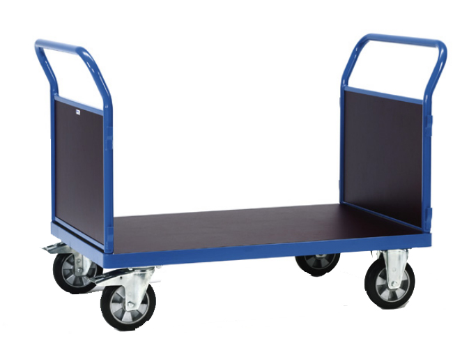 2 roues pivotantes et 2 fixes à bandage caoutchouc.