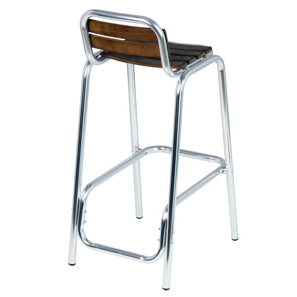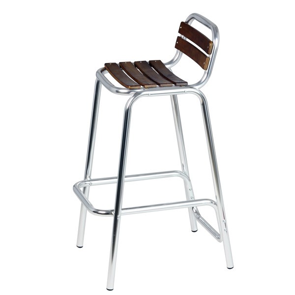 Ce tabouret haut est fabriqué en aluminium, structure vissés, lattes en bois exotique rivetées.