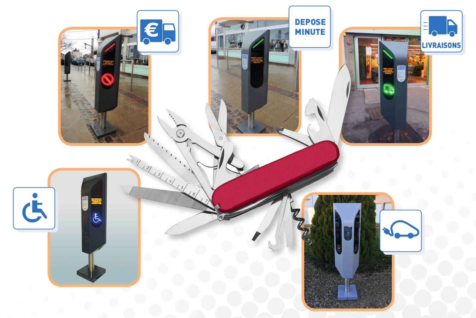 La borne est capable de gérer plusieurs affectations de l'emplacement de stationnement, des PMR aux livraisons en passant par les arrêts-minute ou les convoyeurs de fonds.