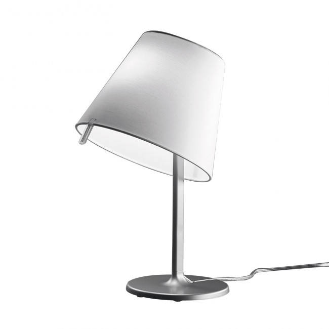 La Lampe de Table Melampo Notte ARTEMIDE intègre une base et un cadre en alliage de zamak laqué gris aluminium, un abat-jour en soie satinée blanc et gris, le tout conçu dans la forme classique d'une lampe de table.