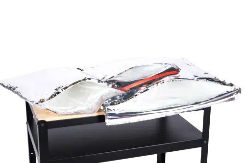 - L’emballage isotherme est constitué d’une double enveloppe en polyéthylène basse densité (PEBD) doublée d’une mousse de PU de 5 mm ou 20 mm d’épaisseur offrant une performance isothermique très élevée.