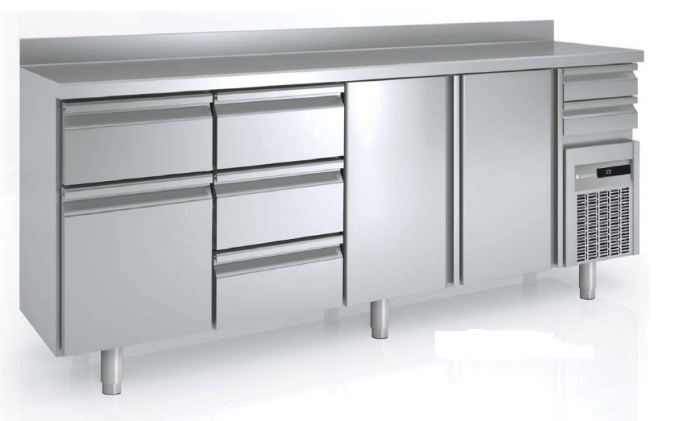 Très robuste et pratique, ce meuble se compose de porte emboutie et réversible avec rappel de porte, charnières inox et joint de porte magnétique déclipsable qui reste ouverte au-delà de 90° ainsi que des tiroirs réfrigérés démontables en inox, montés sur glissières inox télescopiques avec système d’auto-fermeture.