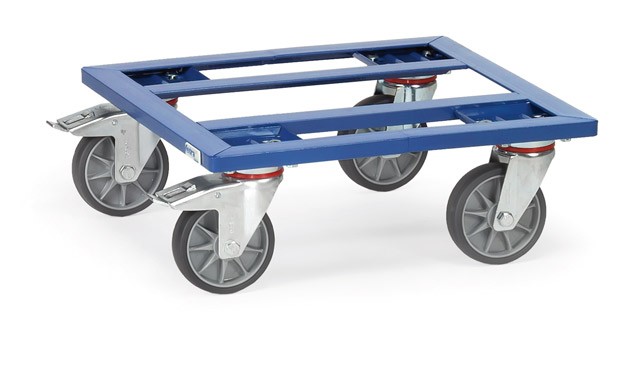 Ce plateau rouleau contient 4 roues pivotantes à bandage TPE dont 2 roues avec freins, conformément à la norme européenne EN 1757-3 (sécurité des chariots de manutention).