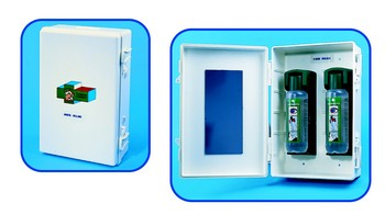 Boîte équipée d’un flacon oculaire contenant une solution capable de neutraliser les acides et les bases.