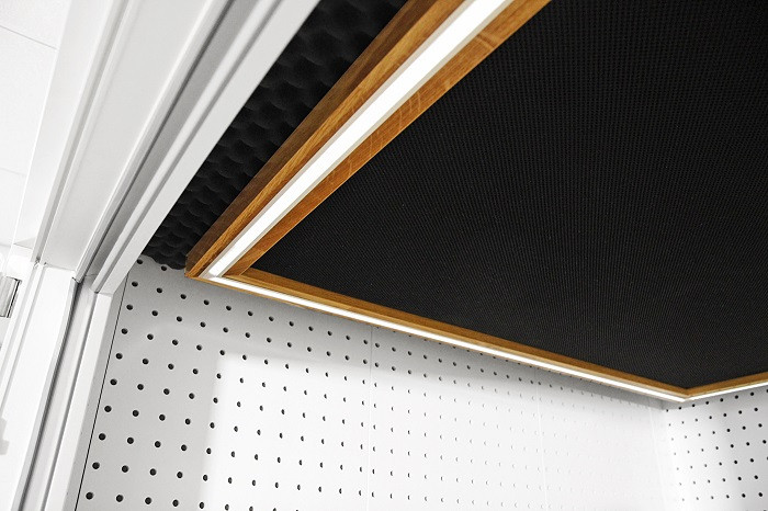 - Au plafond, un absorbeur élimine les mauvaises réflexions et son cadre en bois massif incorpore une rampe de lumière à LED avec contrôle d’intensité lumineuse par télécommande