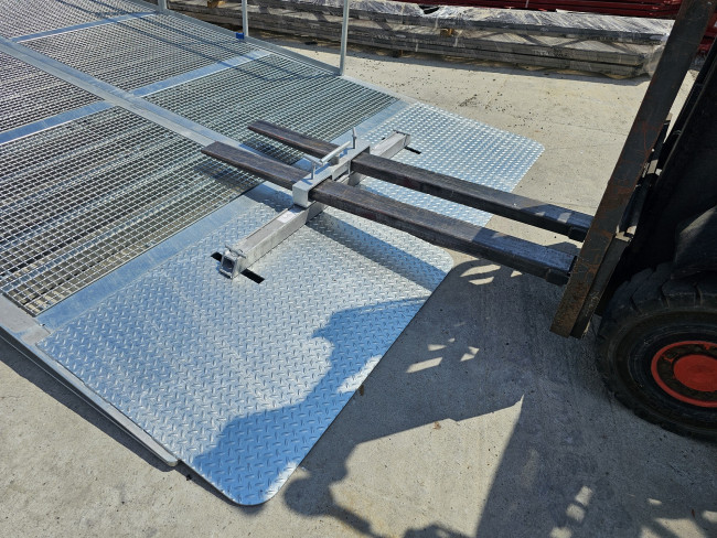4 béquilles de support avec tête adaptatives, Caillebotis cranté anti-dérapant Galvanisé à chaud , Tôle d'amorçage Anti-dérapante, 2 chaines d'arrimage.