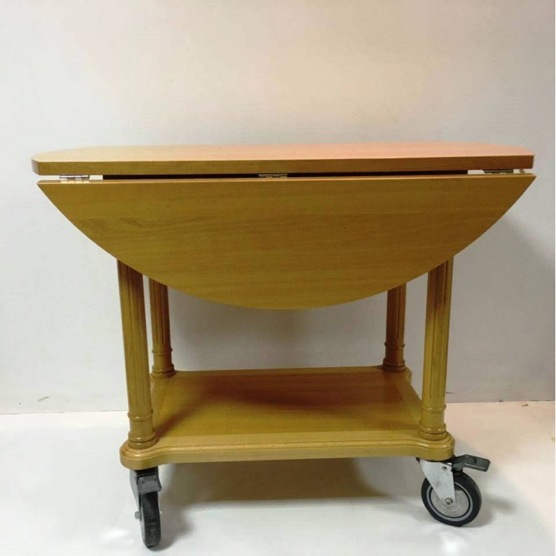 Avec un plateau rond de 100 cm de diamètre, cette table roulante inox ou en hêtre massif (selon la version choisie) offre une large surface pour le service des plats, desserts ou boissons.