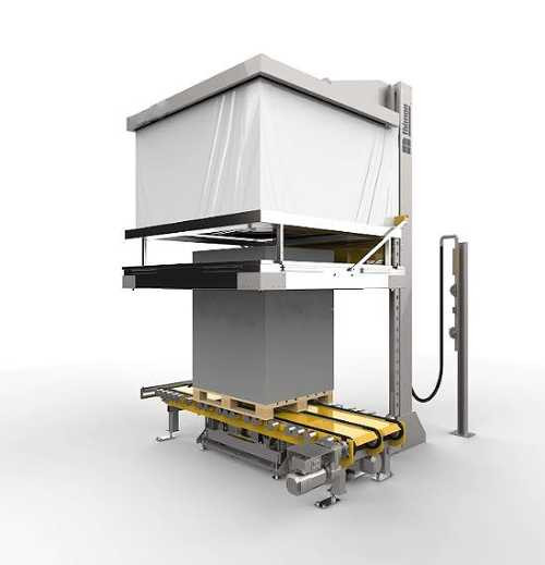 La machine anticipe la hauteur des palettes , ce qui permet d'optimiser l'utilisation du film et de réduire les temps de cycle.