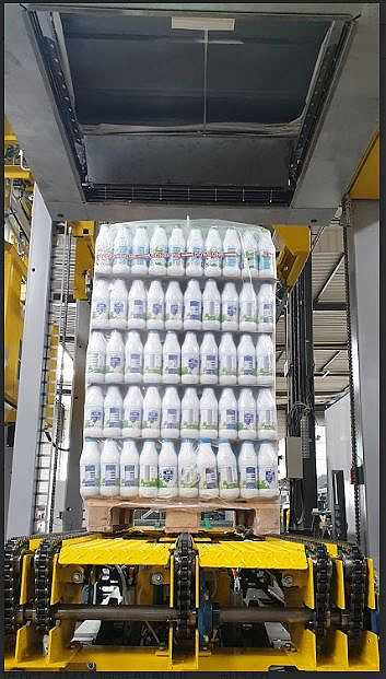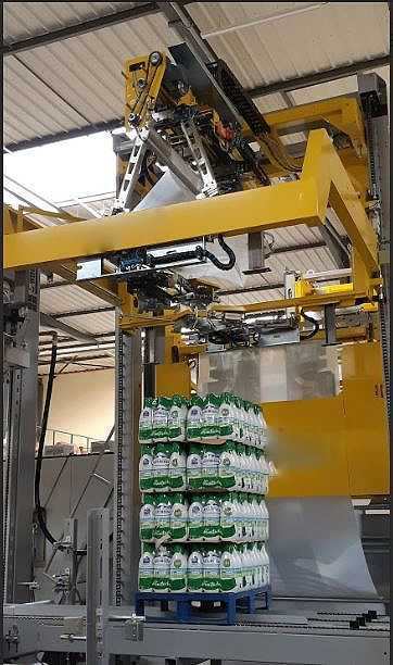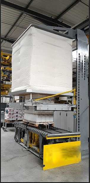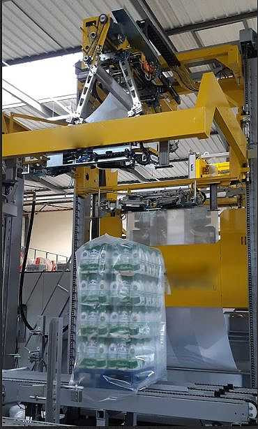 La machine utilise un système d'emballage avec film rétractable par air chaud , garantissant une protection complète et uniforme des produits sur chaque palette.