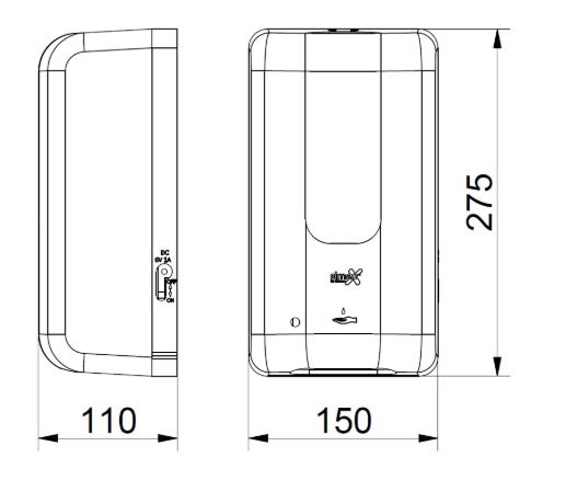 Capacité : 1,2 L Automatique, doses de 1 ml Pour savon liquide / Gel hydroalcoolique Finition : Blanc ou Noir Dimensions : 275 x 150 x 110 mm