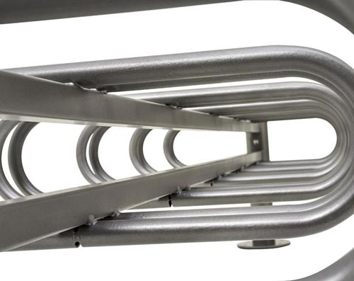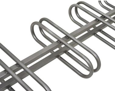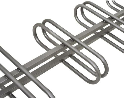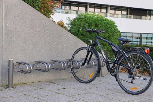 Les griffes, en tube acier Ø22 mm, sont espacées de 50 mm pour permettre un stationnement compact et sécurisé de vélos de toutes tailles, y compris les vélos électriques.