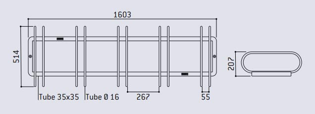 Ce rack à vélos 5 places présente des dimensions de 514 mm de largeur, 1603 mm de longueur et 207 mm de hauteur.