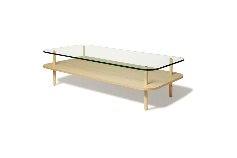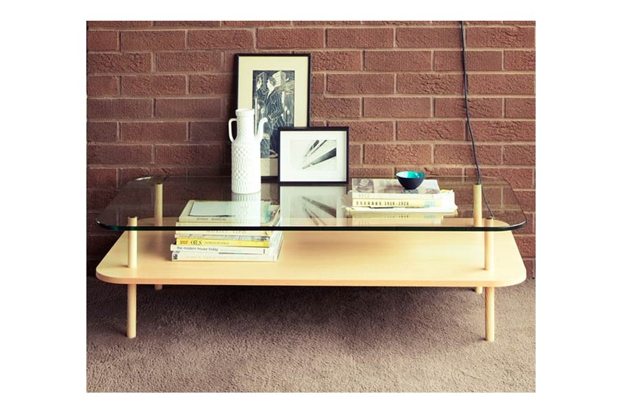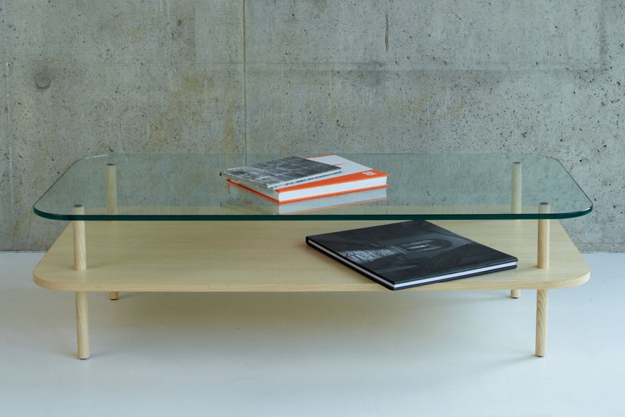 La table basse est composée de deux plateaux, l’un en frêne massif et l’autre en verre trempé.