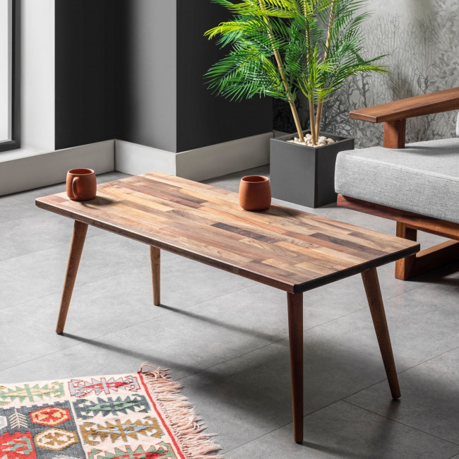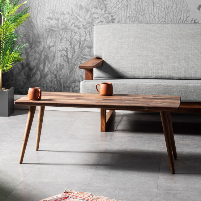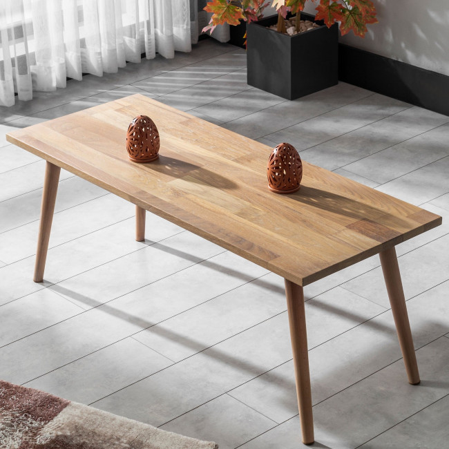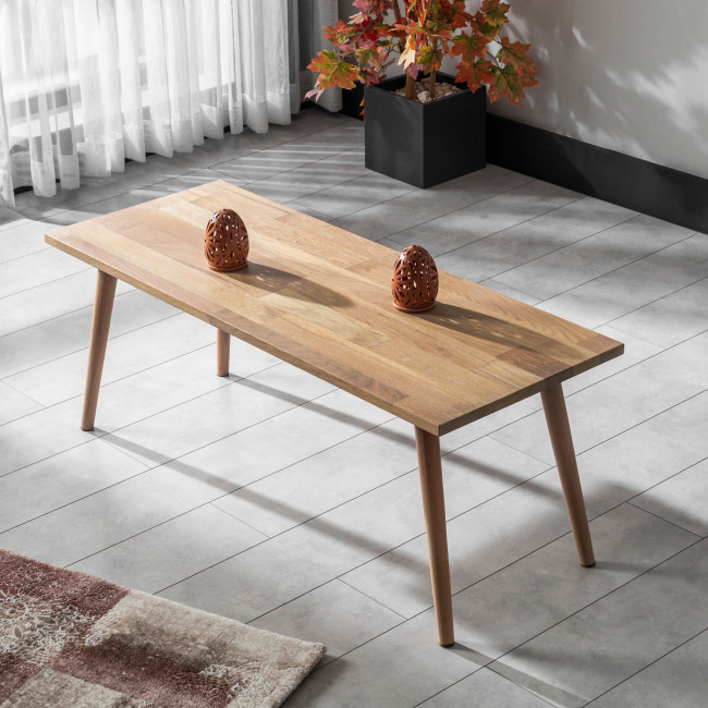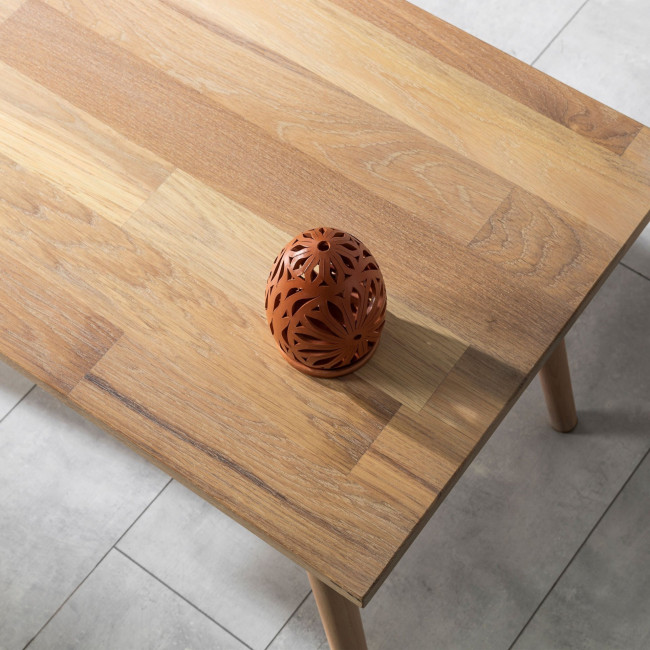 Traitée avec un produit de préservation du bois de qualité supérieure, respectueux de l'environnement et sécurisé pour le contact alimentaire, la surface de la table basse conserve son aspect naturel tout en étant protégée contre les éléments tels que la chaleur, la lumière et l'humidité.