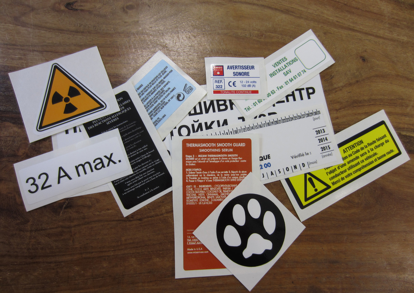 Etiquettes adhésives en vinyle ou polyester, pelliculées livrées en bobines ou en planches, en petites séries. Utilisation à l'intérieur comme à l'extérieur (Lavables et anti UV).
