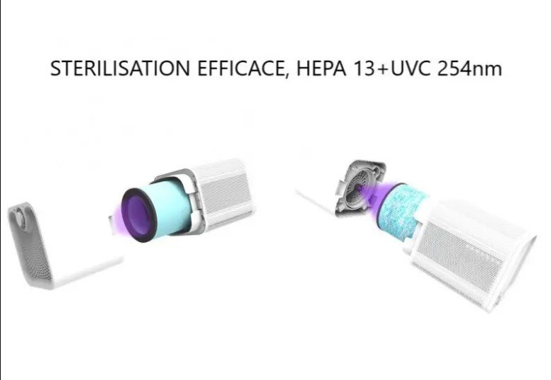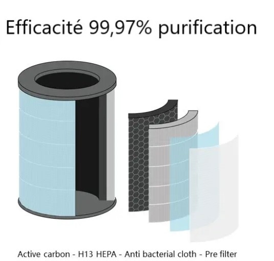 Filtration complète 5 niveaux : préfiltre, charbon actif, tissu antibactérien, HEPA H13, UV-C 254nm