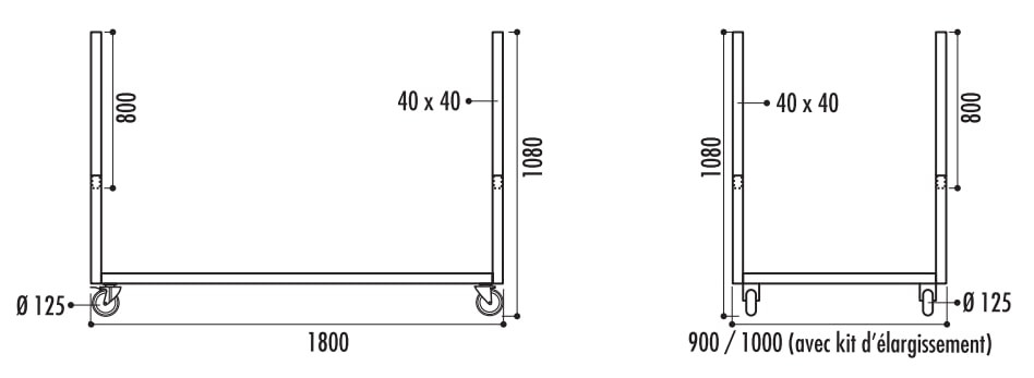 Livré démonté, il se met rapidement en place et peut être complété par un kit d’élargissement et des roues en Ø 200 mm pour s’adapter à vos contraintes de terrain.
