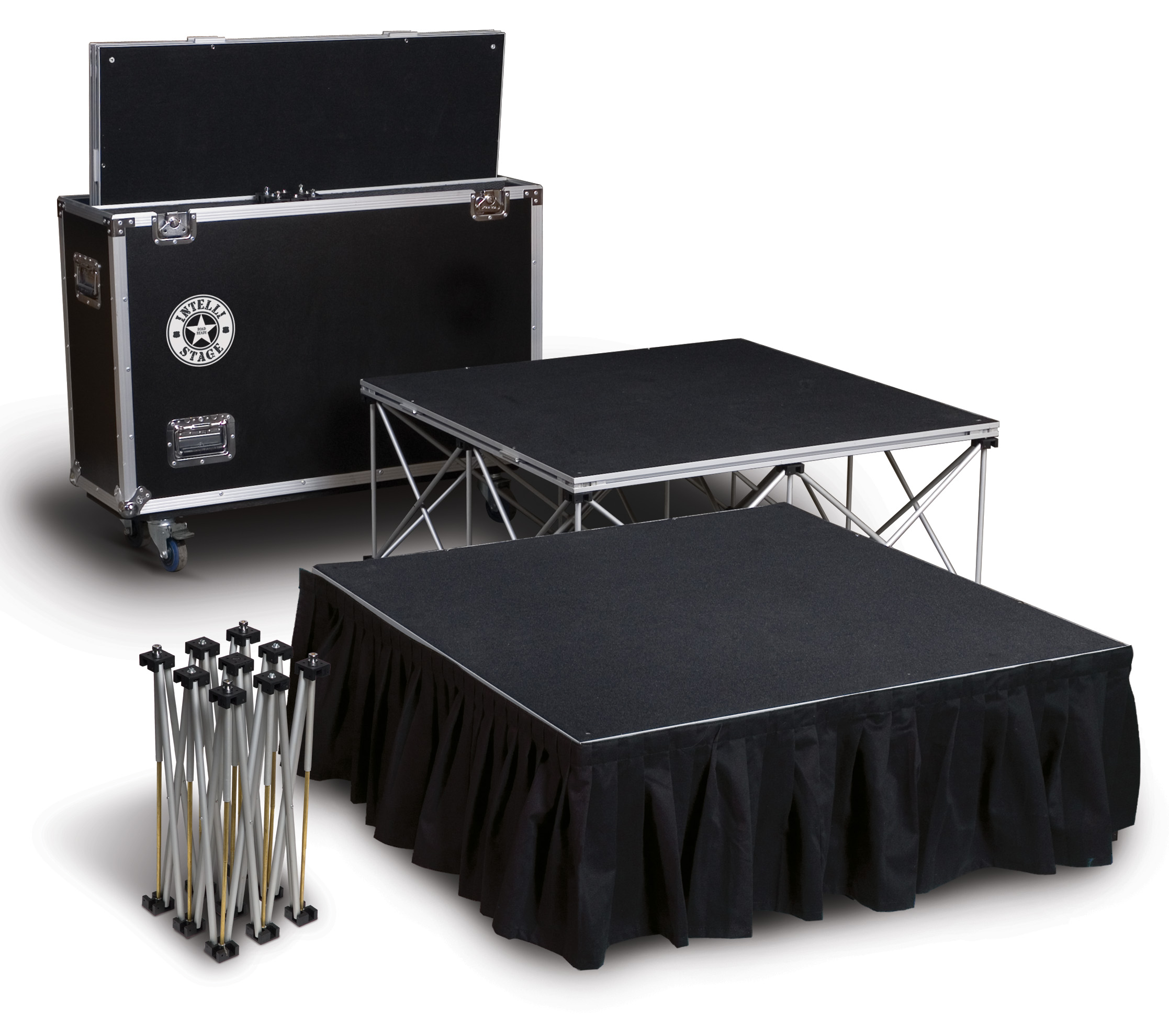 24/09/2024Une estrade de 1m70 x 2m, hauteur 70cm, sol noir, tissu noir + flightcase
